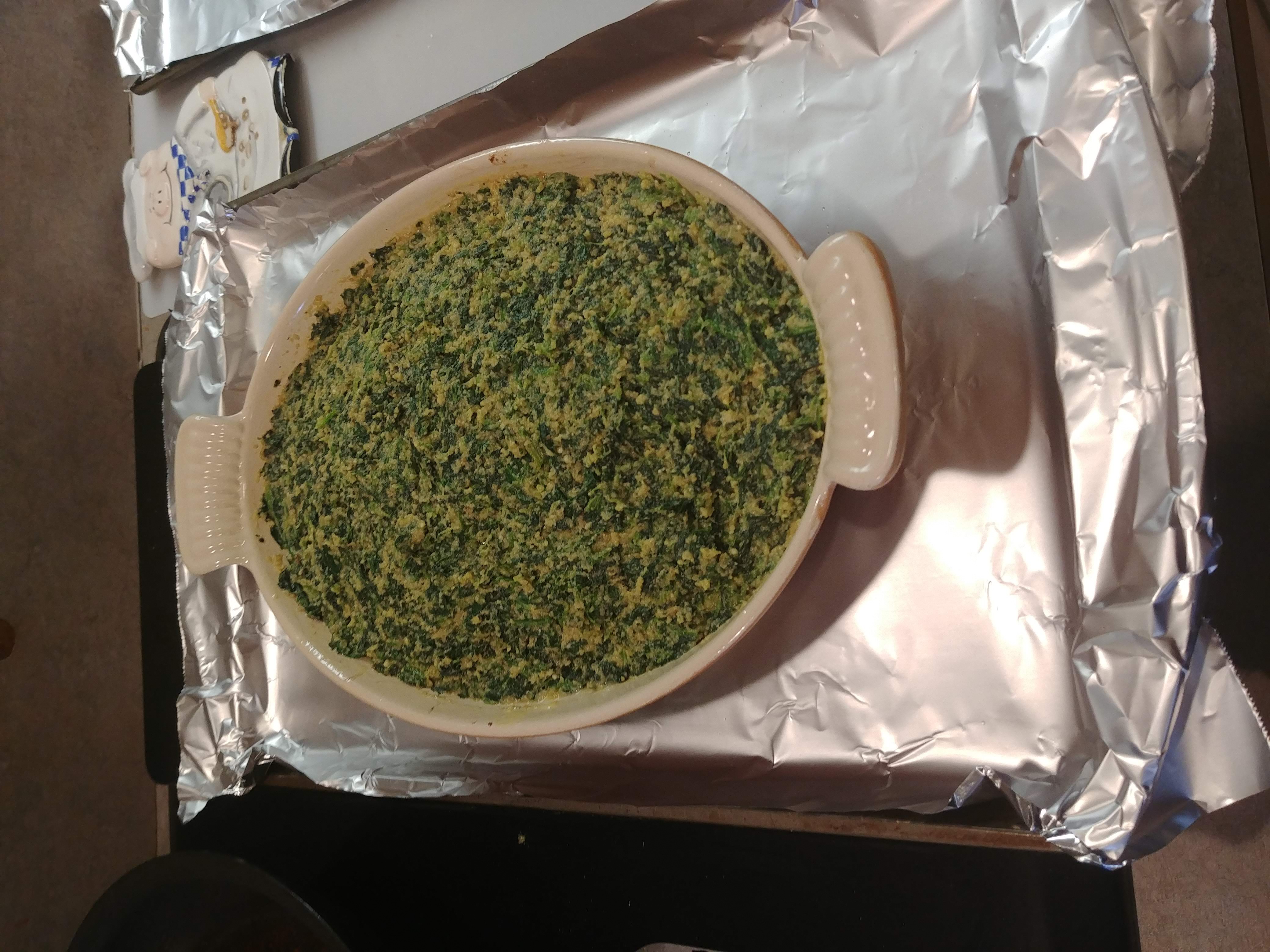 - Prepare spinach according to package directions and drain. Add butter, breadcrumbs, Parmesan, garlic, seasonings and eggs and mix well.